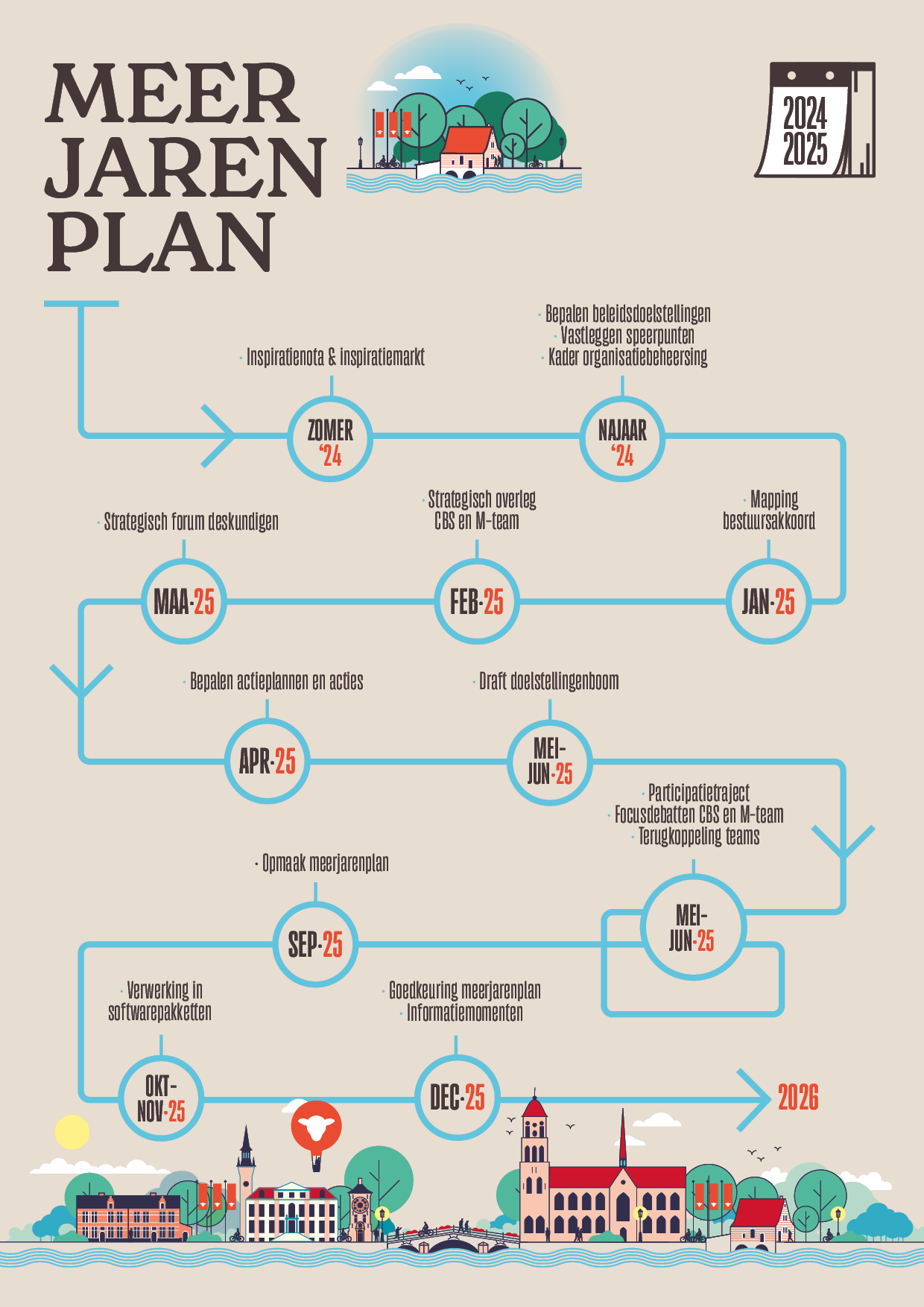 Het meerjarenplan start in het tweede jaar dat volgt op de gemeenteraadsverkiezingen en loopt af op het einde van het jaar na de daaropvolgende verkiezingen. Het is de verantwoordelijkheid en bevoegdheid van de raad om voor het einde van het jaar dat volgt op de verkiezingen een meerjarenplan vast te stellen. De raad kan die bevoegdheid niet delegeren. Omdat het hier gaat over het bepalen en vastleggen van een langetermijnvisie, is gekozen voor zesjarige periodes, gekoppeld aan de gemeentelijke bestuursperiode. Het meerjarenplan is legislatuur gebonden, maar de periode die het bestrijkt valt niet volledig samen met de bestuursperiode. Het is voor één jaar legislatuur overschrijdend, vanuit de idee dat een nieuwe beleidsploeg onmogelijk al meteen op zeer korte termijn tijdens het eerste jaar van haar eigen legislatuur een nieuw meerjarenplan kan maken.