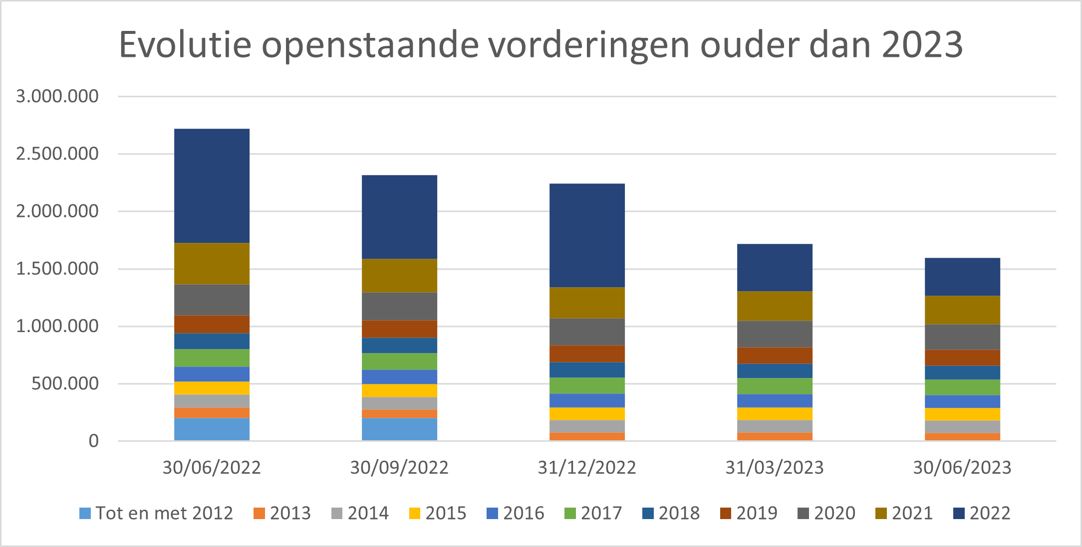 Deze rapportering loopt over de periode 01/01/2023 tot en met 30/06/2023. Voor bespreking van de openstaande vorderingen werden momentopnames gemaakt op 30/06/2022, 30/09/2022, 31/12/2022, 31/03/2023 en 30/06/2023.