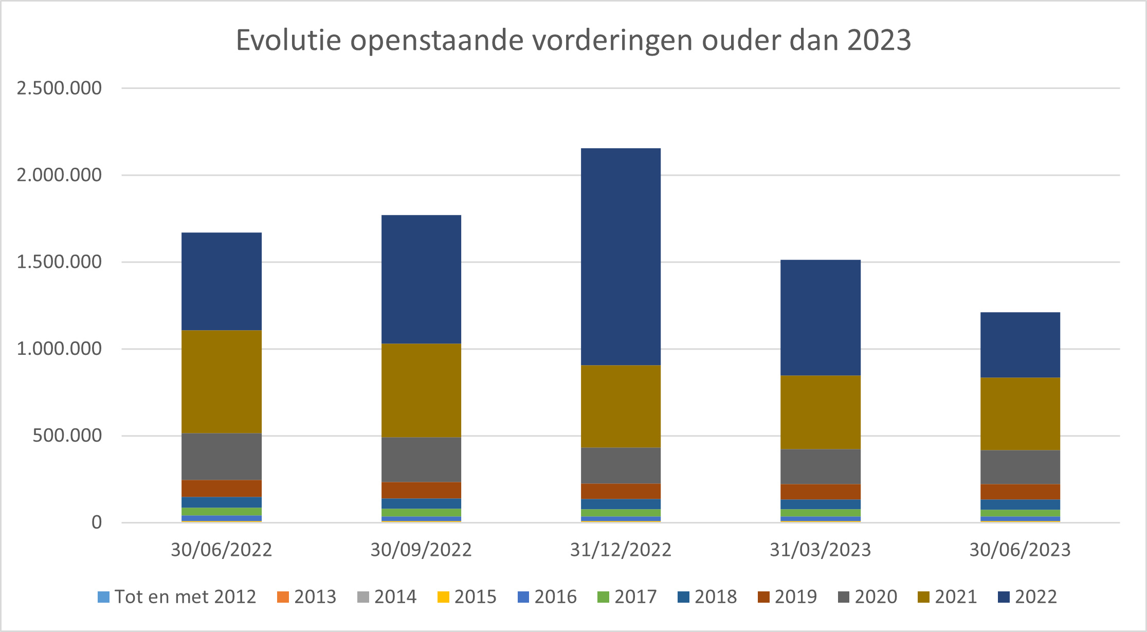 Deze rapportering loopt over de periode 01/01/2023 tot en met 30/06/2023. Voor bespreking van de openstaande vorderingen werden momentopnames gemaakt op 30/06/2022, 30/09/2022, 31/12/2022, 31/03/2023 en 30/06/2023.