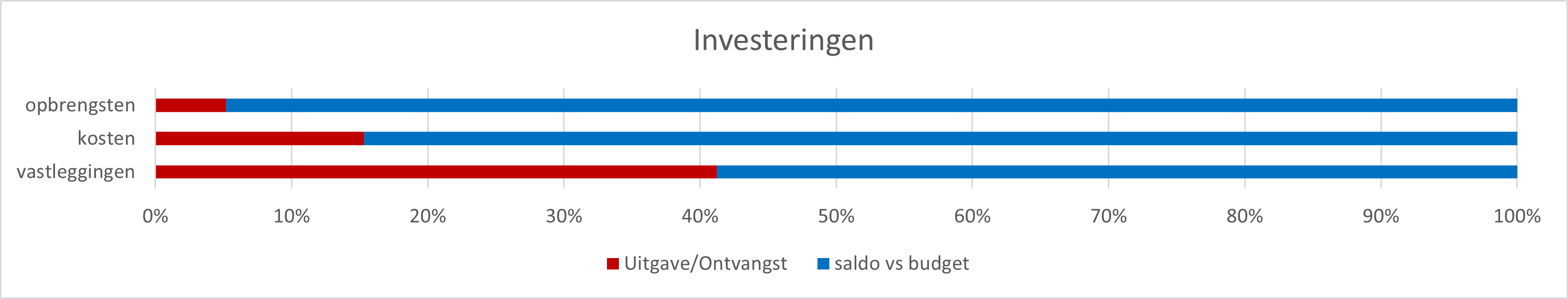 | Investeringen | Budget | vastgelegd/vordering | saldo vs budget | aangerekend | realisatiegraad | ||