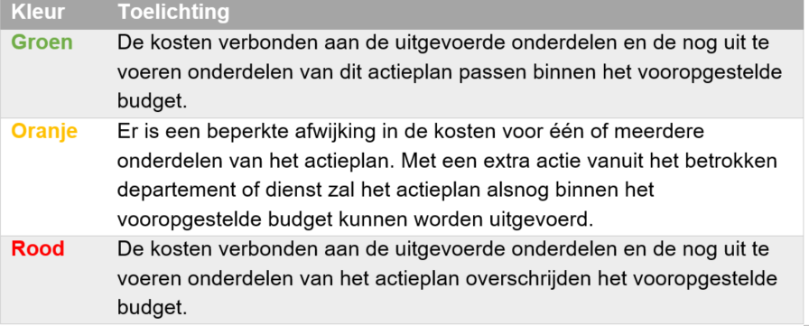 Voor elke prioritair actieplan wordt naast de omschrijving een indicator 'Geld' weergegeven. Deze indicator bestaat uit een kleur (groen, oranje of rood) en een toelichting waarin de aangeduide kleur verder wordt genuanceerd. De tabel hieronder toont een handige legende voor de interpretatie van deze indicator:
