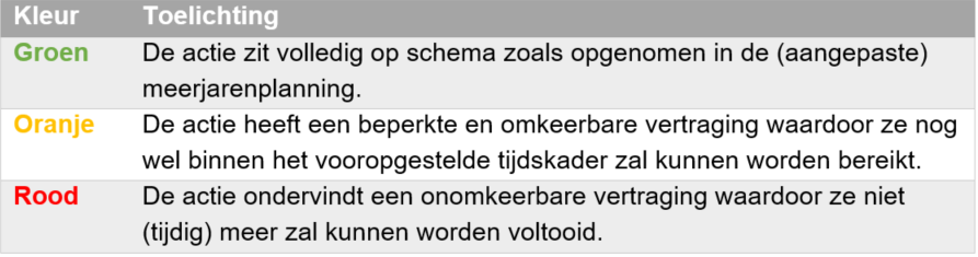 Voor alle prioritaire acties (die onder het bijhorende prioritaire actieplan vallen) geven we een omschrijving, een indicator 'stand van zaken/kwaliteit' (kleur & toelichting) en een indicator 'tijd' (kleur & toelichting) weer.