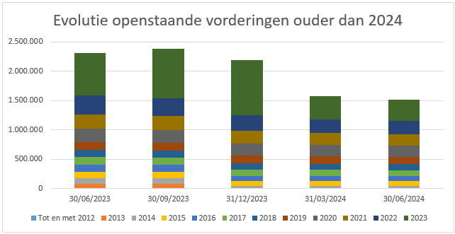 Deze rapportering loopt over de periode 01/01/2024 tot en met 30/06/2024. Voor bespreking van de openstaande vorderingen werden momentopnames gemaakt op 30/06/2023, 30/09/2023, 31/12/2023, 31/03/2024 en 30/06/2024.