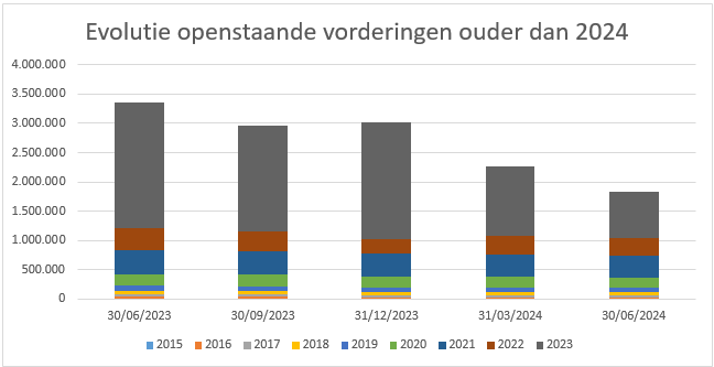 Deze rapportering loopt over de periode 01/01/2024 tot en met 30/06/2024. Voor bespreking van de openstaande vorderingen werden momentopnames gemaakt op 30/06/2023, 30/09/2023, 31/12/2023, 31/03/2024 en 30/06/2024.