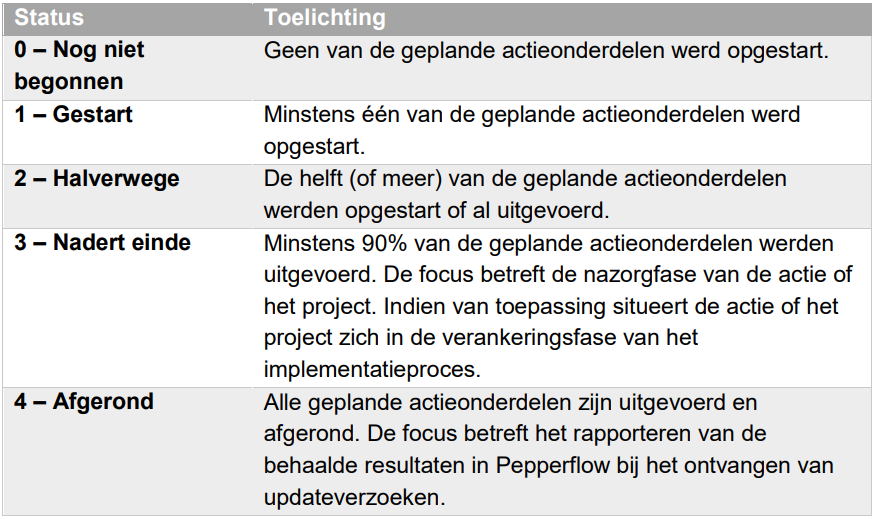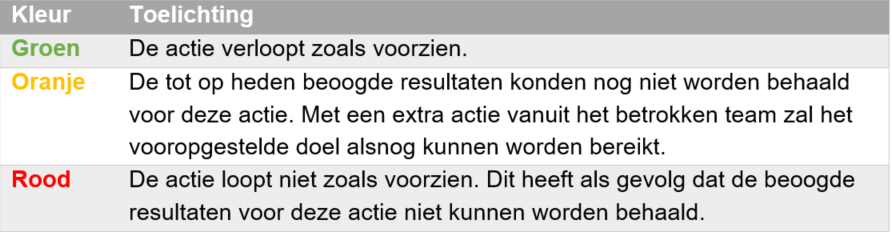 De indicator 'stand van zaken / kwaliteit' focust op het resultaat: In welke mate is het vooropgestelde resultaat voor de actie behaald? De tabel hieronder toont een handige legende voor de interpretatie van deze indicator: