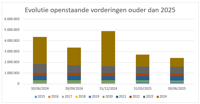 Deze rapportering loopt over de periode 01/01/2025 tot en met 30/06/2025. Voor bespreking van de openstaande vorderingen werden momentopnames gemaakt op 30/06/2024, 30/09/2024, 31/12/2024, 31/03/2025 en 30/06/2025.