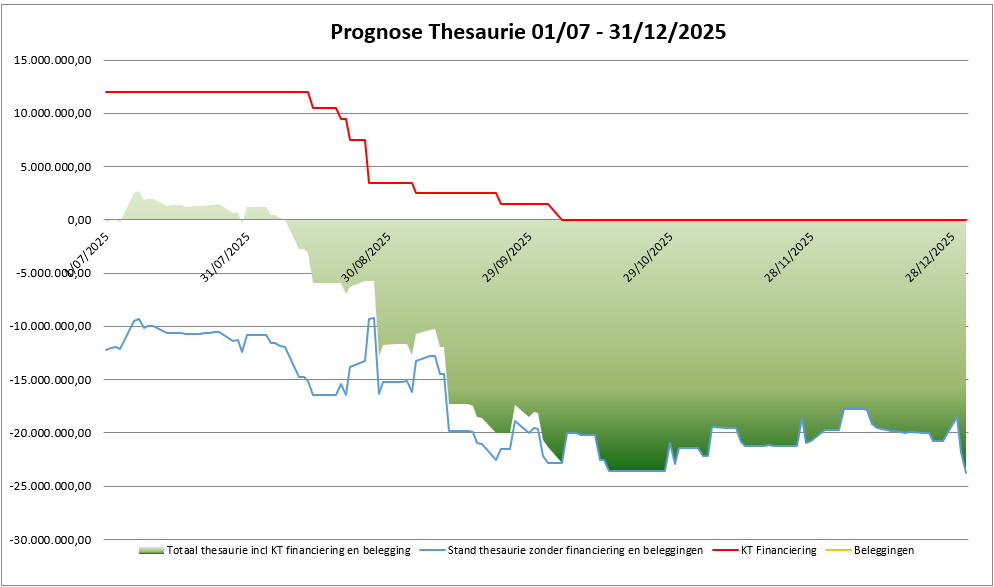 De blauwe lijn geeft aan hoe de rekeningstand zou evolueren indien we geen actie zouden ondernemen op het vlak van thesauriebeheer. De rode lijn geeft de hoogte van de korte termijnfinanciering aan, dewelke we aangaan om het thesaurietekort op te vangen (dus wanneer de blauwe lijn onder nul gaat). De gele lijn geeft aan wanneer er gelden op de spaarrekening worden belegd. Het groene vlak geeft dan de werkelijke stand op rekening, rekening houdend met de korte termijnfinanciering en eventuele tegoeden op de spaarrekening.